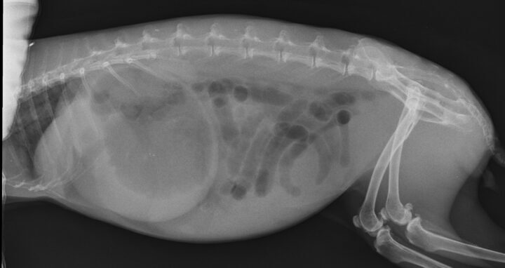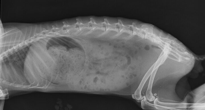 Diagnosis is often by radiography, which should be performed following administration of analgesia and sedation if required. Radiographs show severe gaseous distension of the stomach, often taking up 50 percent of the abdominal cavity (Huynh and Pignon, 2013). In some cases, the bowel can be visualised cranial to the stomach (Mitchell et al., 2010) (Figure 5). It is important to note that the classic “double bubble” seen in cases of GDV in canine patients is not always seen radiographically, and diagnosis of GDV in guinea pigs should not be ruled out based on the absence of this sign.