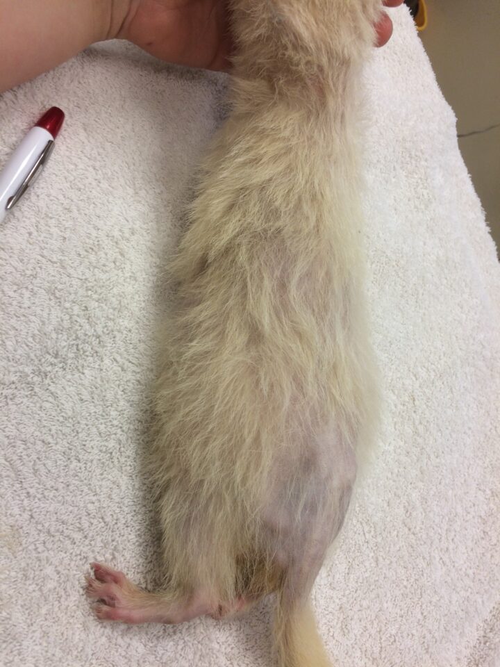 Clinical signs of hyperadrenocorticism in ferrets include thinning of the skin, muscle atrophy, a pot-bellied appearance, sexual aggression and bilaterally symmetrical alopecia with “rat tail” (Figure 1) (Oglesbee, 2011). Alopecia usually begins in spring, at the start of the normal breeding cycle (Schoemaker, 2009). Progressive alopecia of a neutered ferret is considered pathognomonic for the disease (Chitty, 2013).