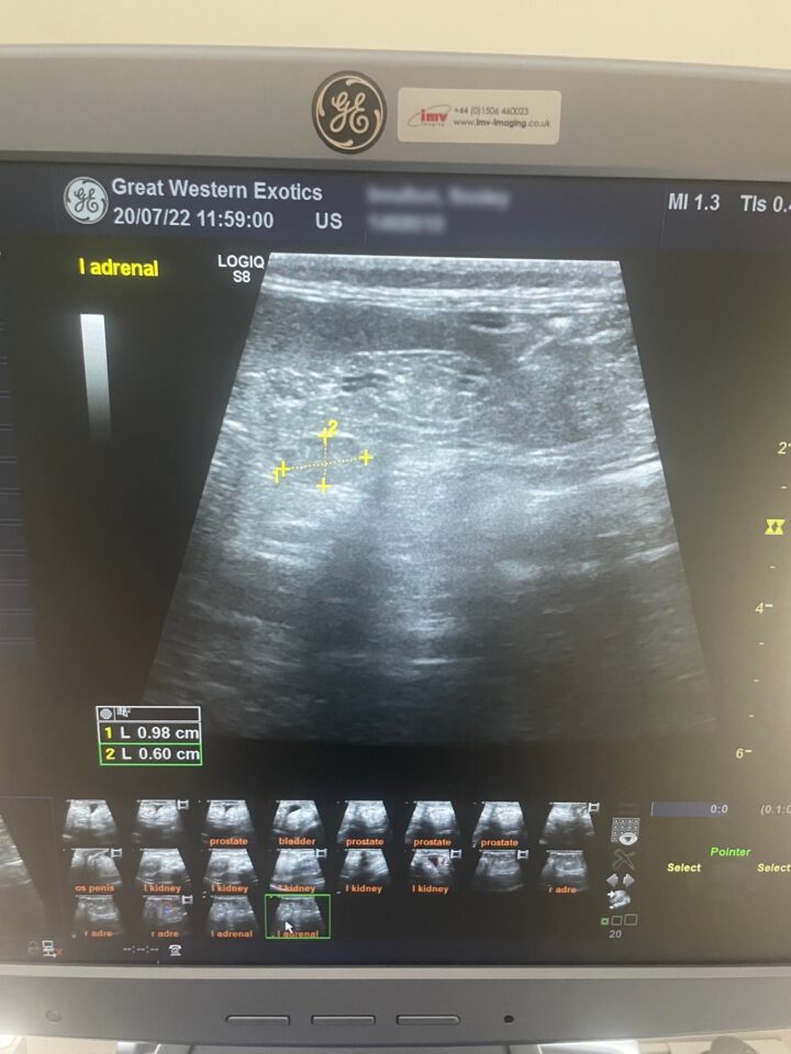 Ultrasound is a useful tool to visualise the adrenal glands and assess if one or both are enlarged (Oglesbee, 2011). Guidelines for identifying both adrenal glands have been described, which allows veterinarians to assess the size of each (Kuijten et al., 2007). Normal adrenal glands usually measure 2 to 3.7mm wide and 4 to 8mm long (Oglesbee, 2011). Adrenal glands are abnormal if they have an enlarged cranial or caudal pole (over 3.9mm), have a rounded appearance, show increased echogenicity and/or contain mineralisation (Figure 3) (Kuijten et al., 2007).