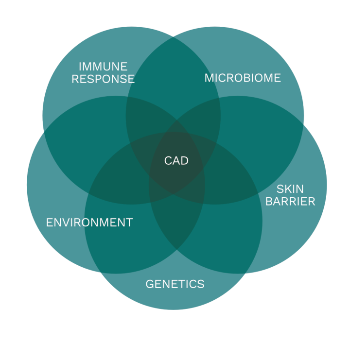 The simplistic view of CAD which was held last century (type 1 hypersensitivity reaction to environmental allergens, which for a long time were thought to be inhaled, leading to pruritus) has now been superseded by the recognition of a much more complex disease process through the interaction of a range of factors (Figure 1). CAD is not just a hypersensitivity reaction to environmental allergens.