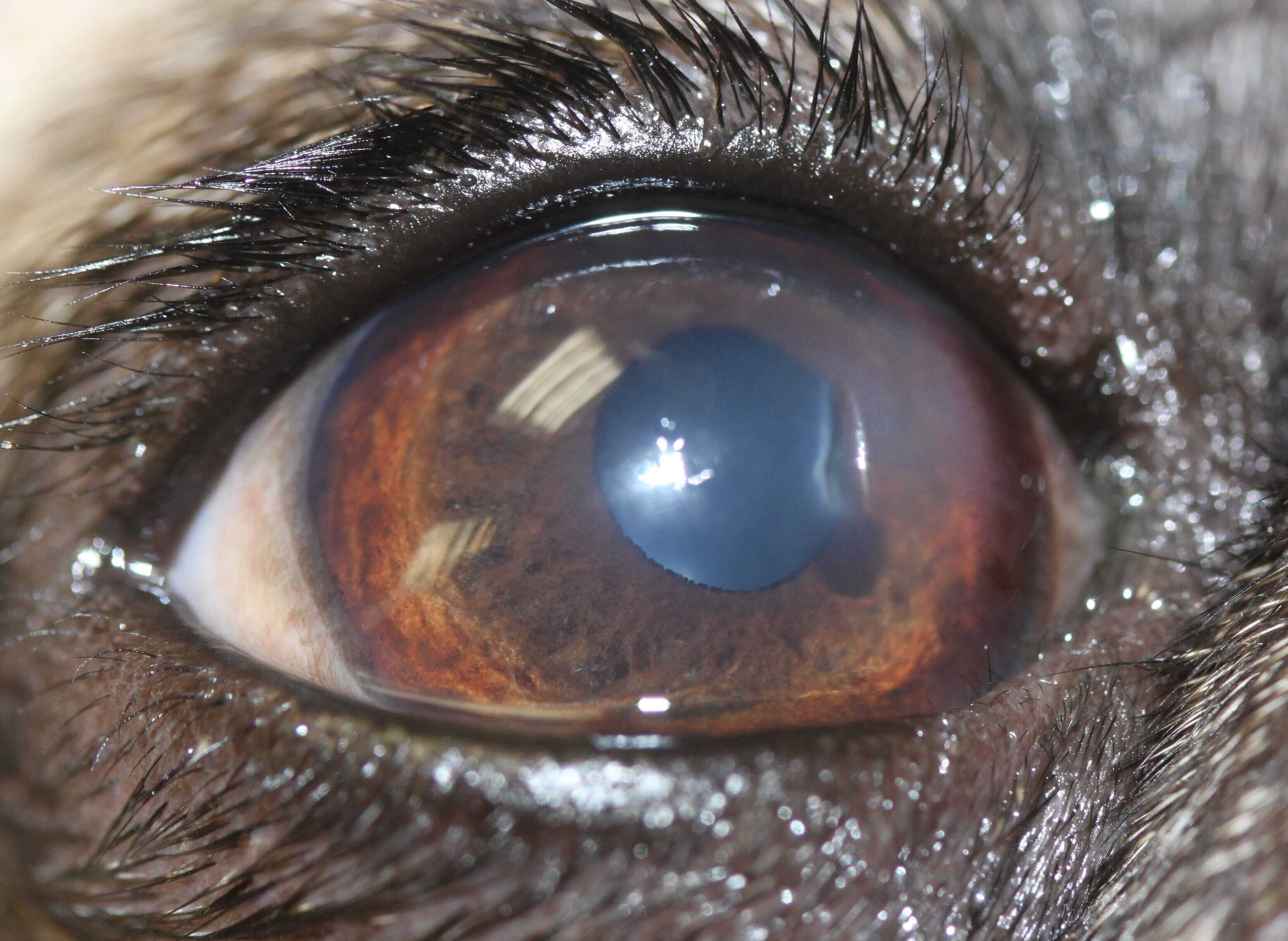 Corneal pigmentation is very common in Pugs – the incidence reported varies from 70.0 to 87.8 percent (Labelle et al., 2013; Krecny et al., 2015; Vallone et al., 2017; Maini et al., 2019). Many brachycephalic breeds, Pugs in particular, have some degree of medial lower lid entropion and the resultant chronic low-grade irritation can cause pigmentary keratitis to form (Vallone et al., 2017) although in the earlier paper by Labelle et al. (2013), there was no association with eyelid conformation and presence of corneal pigment identified. The pigment can be accompanied by visible vascularisation and also a whorl shape of corneal opacity (Figure 6). The caruncle, which is the small fleshy protrusion just inside the medial canthus, frequently has hairs growing on it, which can also contribute to both the development of pigment on the cornea but also to ulceration – especially in longer-coated breeds such as the Shih Tzu and Pekingese. Other cilia-related abnormalities which can be detrimental to brachycephalic ocular health include distichiasis, ectopic cilia and nasal fold trichiasis.