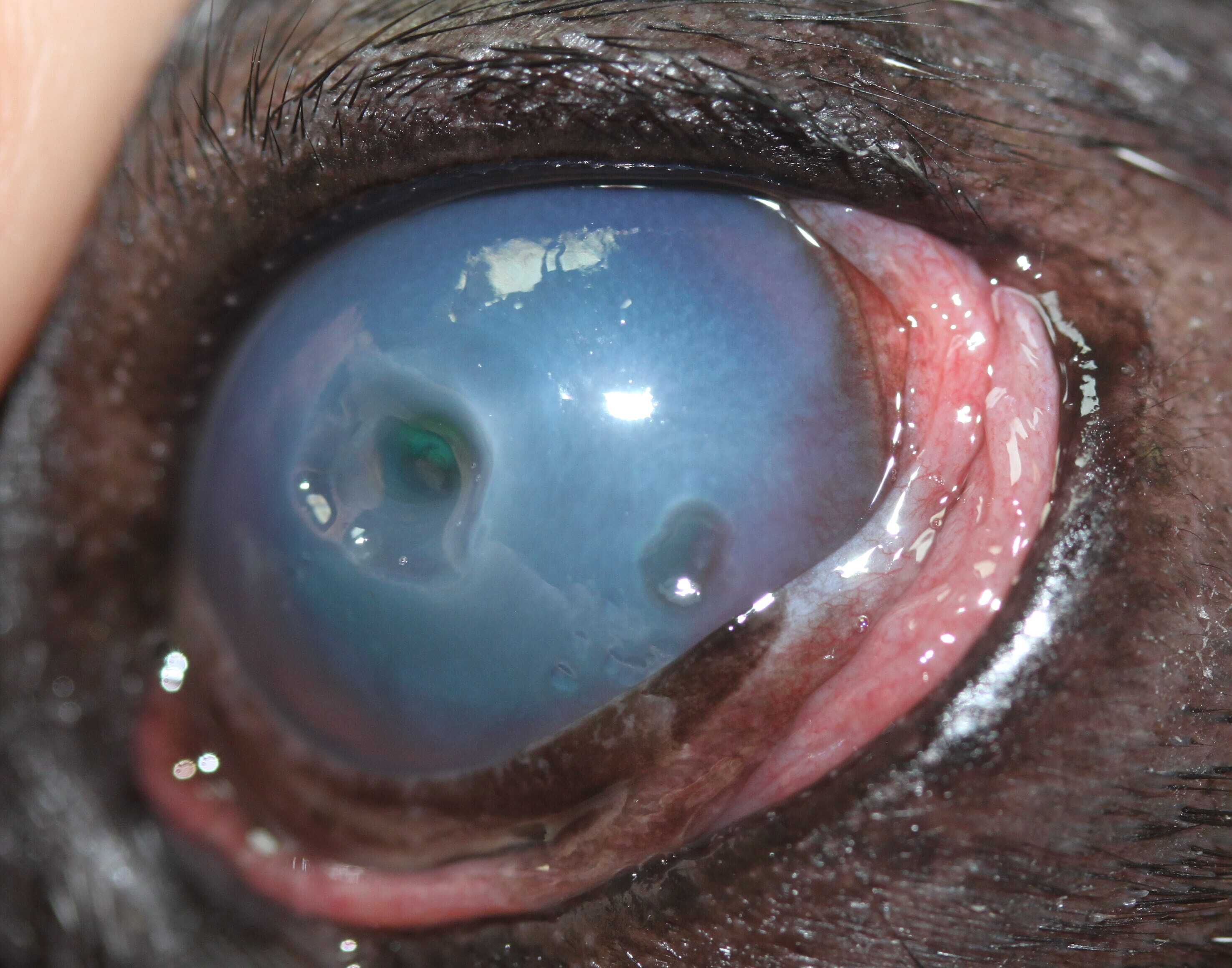 No discussion of brachycephalic eye problems would be complete without mentioning keratoconjunctivitis sicca (KCS, dry eye). Box 1 lists the common clinical signs of KCS. Quantitative KCS results from a reduction in the aqueous portion of the tear film and is diagnosed by performing a Schirmer tear test (STT) (readings less than 15mm/min are classified as KCS). Aqueous tear production has been demonstrated to be lower in brachycephalic dogs compared to non-brachycephalics (Bolzanni et al., 2020) and this is thought to be linked to the reduced corneal sensitivity we have already considered. An incidence of KCS in Pugs of approximately 15 percent has been reported (Krecny et al., 2015) and there was a significant association between KCS and corneal pigmentation in this study. Corneal vascularisation is another feature of KCS, as is ulceration, which can be rapidly progressive and severe (Figures 7 to 9). Given the lagophthalmos we have already mentioned, evaporation of tears from the central cornea is a significant problem, and so supplementing with artificial lubricants in dogs with borderline STT readings, and starting lacrimostimulants (eg ciclosporin or tacrolimus) sooner rather than later is sensible.