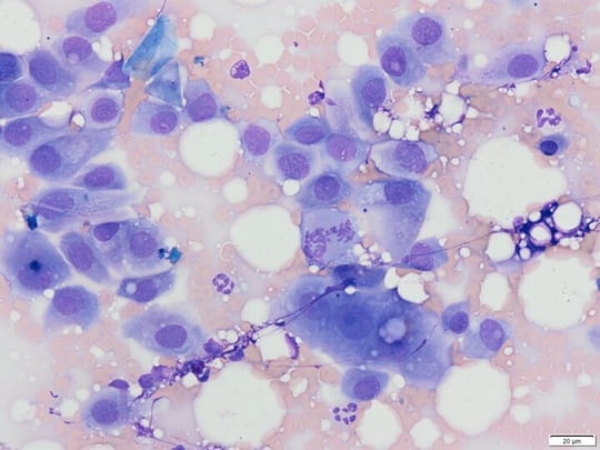 Haematology, biochemistry and urinalysis were unremarkable. Abdominal ultrasonography identified a large heterogenous prostate and marked local lymphadenopathy, raising concern of metastatic neoplasia. Fine needle aspiration was performed and was consistent with prostatic carcinoma (Figure 3). The patient was euthanised due to progressive disease and clinical signs.