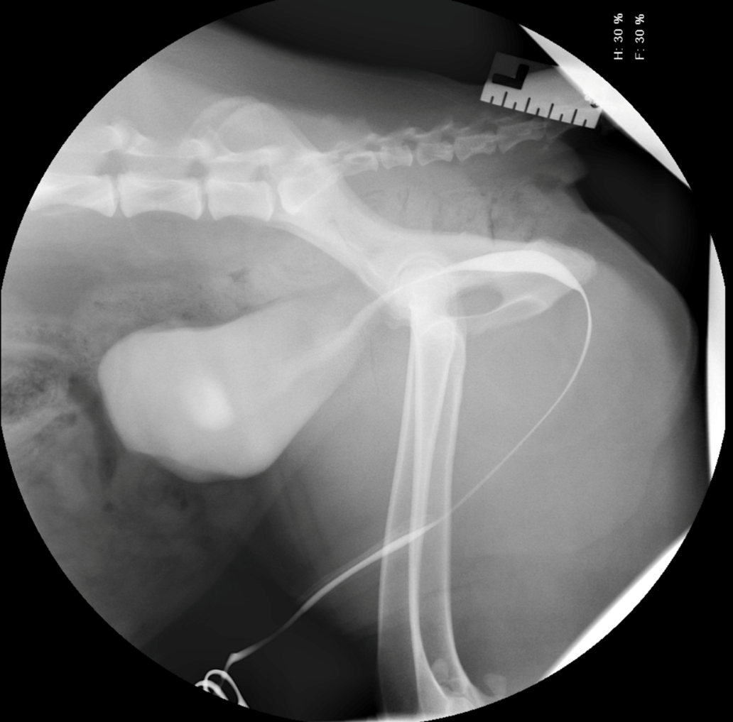 Retrograde contrast study | Visualises radiolucent uroliths and urethral strictures/tears | |