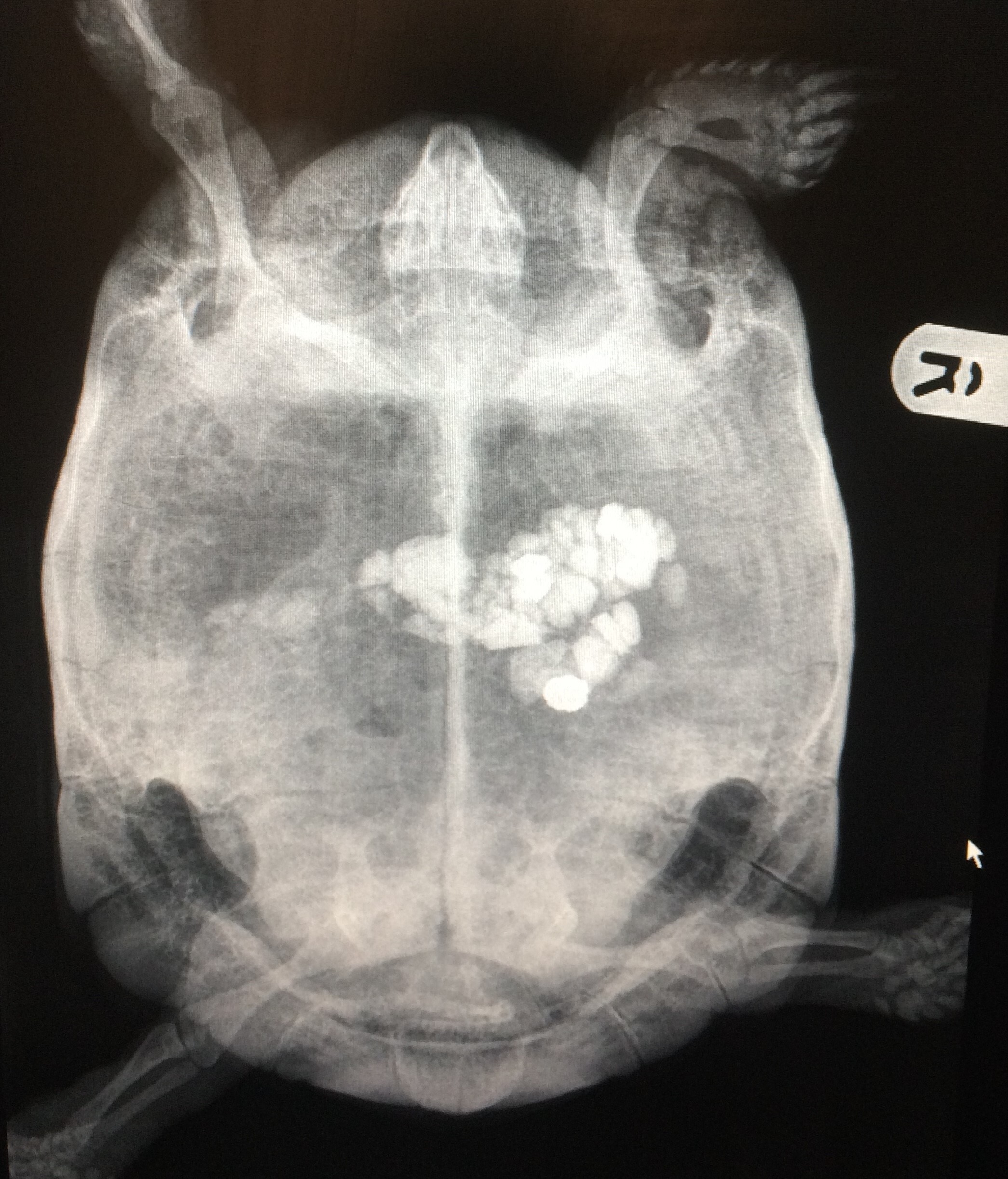 If replacement of the prolapsed tissue is not possible at first presentation, the use of protective wraps such as cling film or plastic wrap can help keep hypertonic saline soaked swabs or lubricant in place, preventing trauma to the prolapsed tissue (McArthur and Machin, 2019a). Initial work-up should always include imaging (McArthur and Machin, 2019a). Radiographs can help identify metabolic bone disease, urolithiasis, presence of eggs (Figure 4) and severe constipation (Figure 5). Other diagnostics to consider include faecal parasitology, biochemistry and haematology, and ultrasound examination (McArthur and Machin, 2019b).