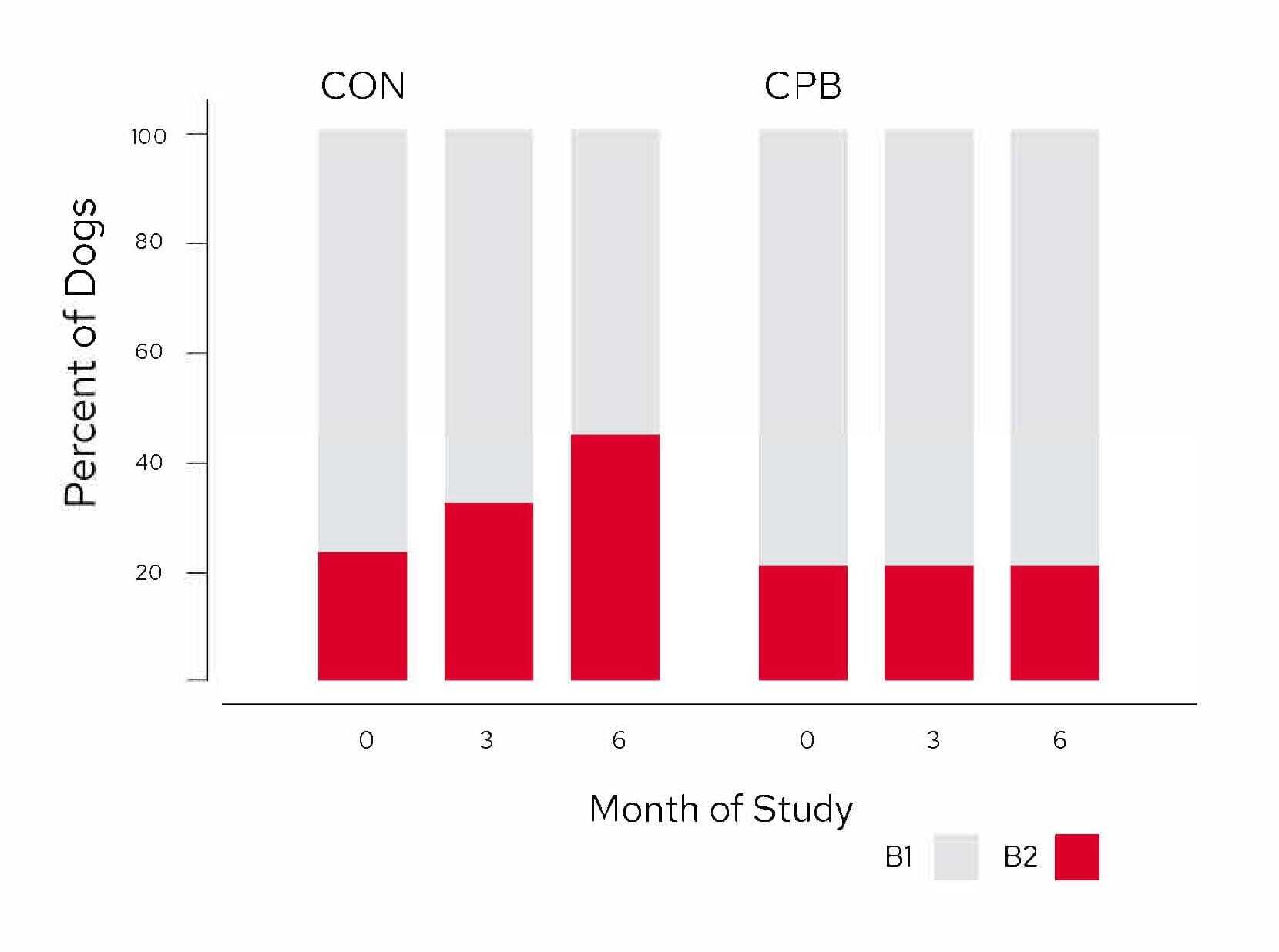 MMVD dogs fed the blend of nutrients showed an improvement in left atrial size: this effect was evident after three months and persisted throughout the six-month study period. More specifically, a 2.9 percent decrease in left atrial diameter and a decrease in left atrial-to-aortic-root ratio was observed in MMVD CPB-diet dogs after six months. In contrast, MMVD CON-diet dogs showed an increase in both of these measures, with left atrial diameter increasing by 10.8 percent and left atrial-to-aortic-root ratio by 9.5 percent over six months. Mitral regurgitation was reduced in 30 percent of the MMVD CPB-diet dogs during the study (Figure 1). Moreover, while 37 percent of MMVD CON-diet dogs progressed from stage B1 to B2 during the study, none of the MMVD CPB-diet dogs showed progression (Figure 2).