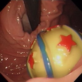 Other gastric FBs are simply too large to retrieve, either because they cannot be grasped or they are too large to pull back through the lower oesophageal sphincter (LOS) even though the patient managed to swallow them (Figure 2). Indeed, the availability and size of grasping instruments restrict the range of FBs that can be retrieved endoscopically. Unless the endoscope has a large channel (preferably 2.8mm), many instruments cannot be passed. However the large channel results in a larger endoscope tip diameter, precluding some attempts in small dogs and cats.