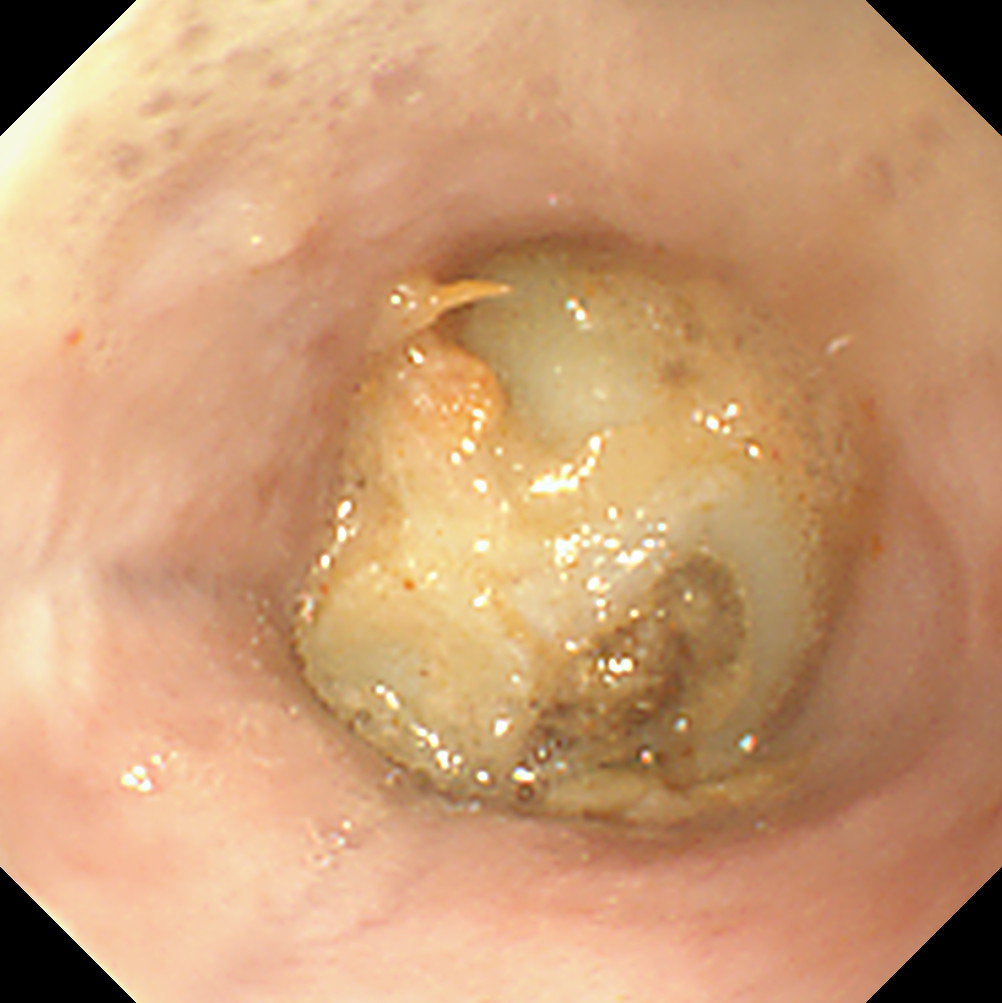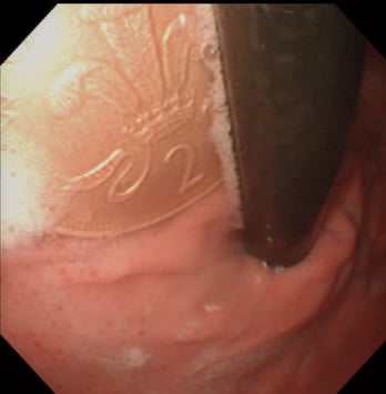 If the patient has just eaten, visualising the FB can be difficult. Unless one has the luxury of a peristaltic flushing pump to wash the gastric surface endoscopically, it may be better to wait a few hours until the food has passed. However, this assumes there is no risk of the FB passing into the duodenum or perforating.