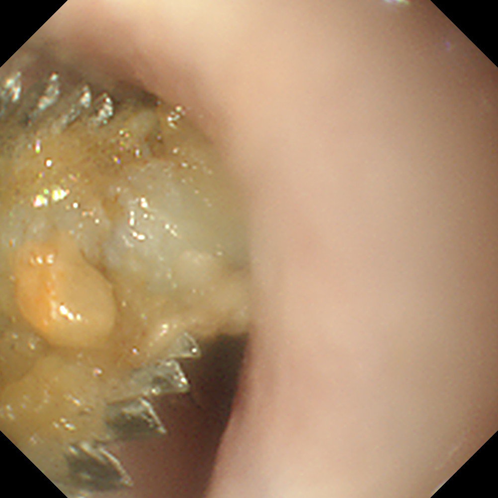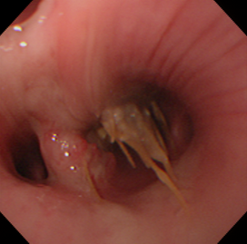 Some gastric FBs, such as bones or potatoes, do not need removal as they will be digested, yet they will need to be removed if they are stuck in the oesophagus. Also, it may not be safe to try to remove sharp objects endoscopically. Ingested fishhooks often lie free in the GI lumen and are retrieved by gripping the curved part so that the hook is pointing backwards (Figure 1). If the barb is lightly embedded in the mucosa, it may be possible to rip it out, but if it is more deeply embedded, which is likely if someone has yanked on the fishing line exiting the mouth, it may be possible to force it forward, back into the lumen. However, surgical removal may be needed.