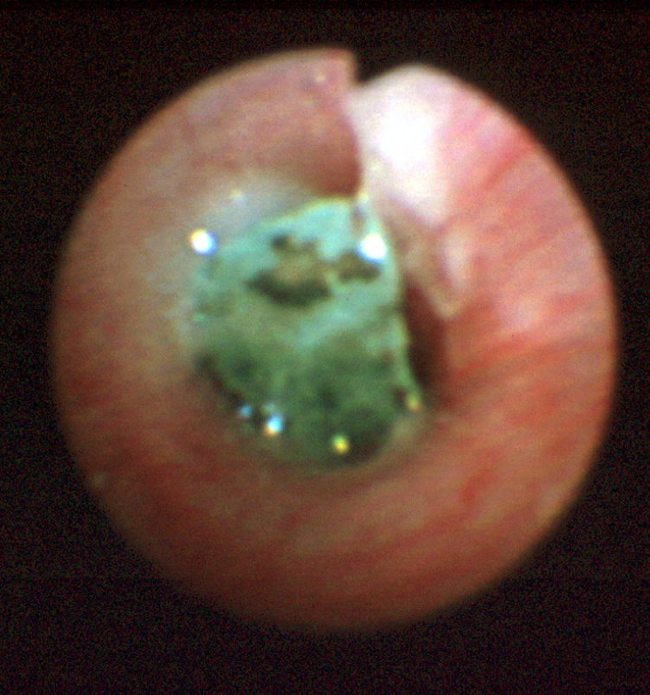 Nasal FBs may be visualised and retrieved by rigid endoscopes and forceps placed anterograde, but retroflexion of a flexible endoscope may be necessary to retrieve FBs lodged above the soft palate; blades of grass and other plant material are most common (Figure 6A). However, the limited space in the pharynx makes retroflexion difficult. It is always worth first retracting the soft palate with a spay hook and looking with a dental mirror. It may then be possible to grab the FB with curved/angled artery forceps.