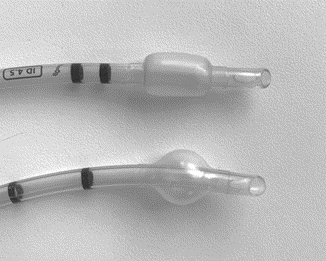 ETT cuffs are inflated when the practitioner connects a syringe to a pilot valve, thus creating a seal within the trachea. Cuffs may be low volume/high pressure (LV/HP) or high volume/low pressure (HV/LP) (Figure 2):