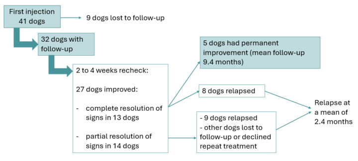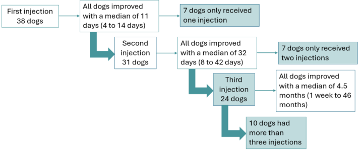 In our experience, a single injection of methylprednisolone acetate to assess the analgesic effect obtained before repeating the procedure may be a useful approach. Gomes et al. (2020) tested this idea in a prospective study where 27 dogs out of 32 (84.4 percent) improved following a single injection. These dogs were then followed up without a repeat injection and received surgery in case of relapse. The complete follow-up is summarised in Figure 3. This shows that a subset of dogs (5 of 32 dogs) may have long-lasting benefits from one injection. The timing for the second injection, or even subsequent injections, remains currently uncertain in the absence of more data.