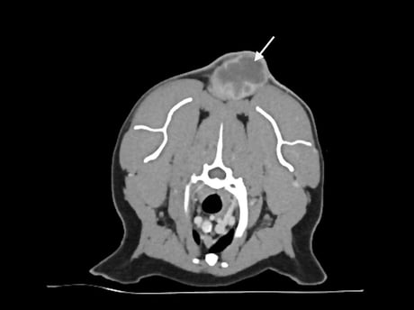 FISSs typically have long finger-like projections lateral and deep to the main mass and can also have smaller “satellite” nodules peripheral to the primary tumour. Contrast-enhanced computed tomography (CT), or less commonly MRI, helps visualise these and aid surgical planning (Figure 1). For interscapular ISS, post-contrast CT scans should be performed with the forelimbs extended both cranially and caudally along the body, as this allows a better understanding of the relationship between the tumour and adjacent tissue (Longo et al., 2018). As the surgical dose for ISSs can be large, imaging should include the abdominal and thoracic cavities to screen for comorbidities that may preclude a more invasive treatment approach.