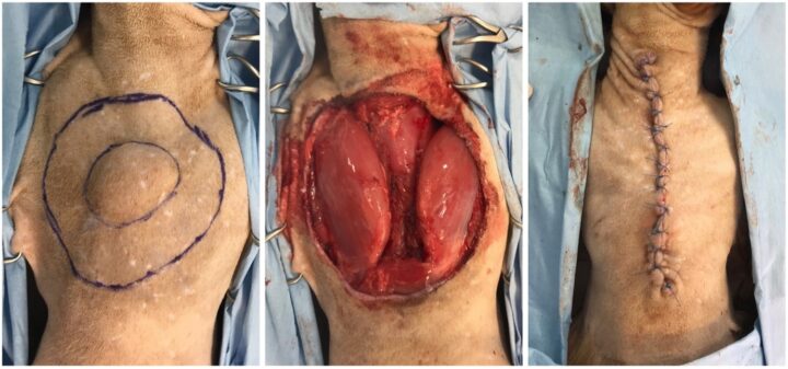 Currently, it is advised to resect ISSs with 5cm lateral margins and two uninvolved fascial planes as the deep margin, although this can be reduced to 3cm lateral margins if based on CT imaging. This results in complete excision in 95 to 97 percent of cases compared to 50 percent when only 3cm lateral margins (based on palpation) are obtained (Davidson et al., 1997; Hershey et al., 2000; Phelps et al., 2011; Romanelli et al., 2008). For ISSs in the interscapular region, surgery often involves the excision of dorsal spinous processes and the tips of the scapula, whereas body wall resection or amputation are usually required for ISSs of the flank and extremities, respectively (Figure 2).
