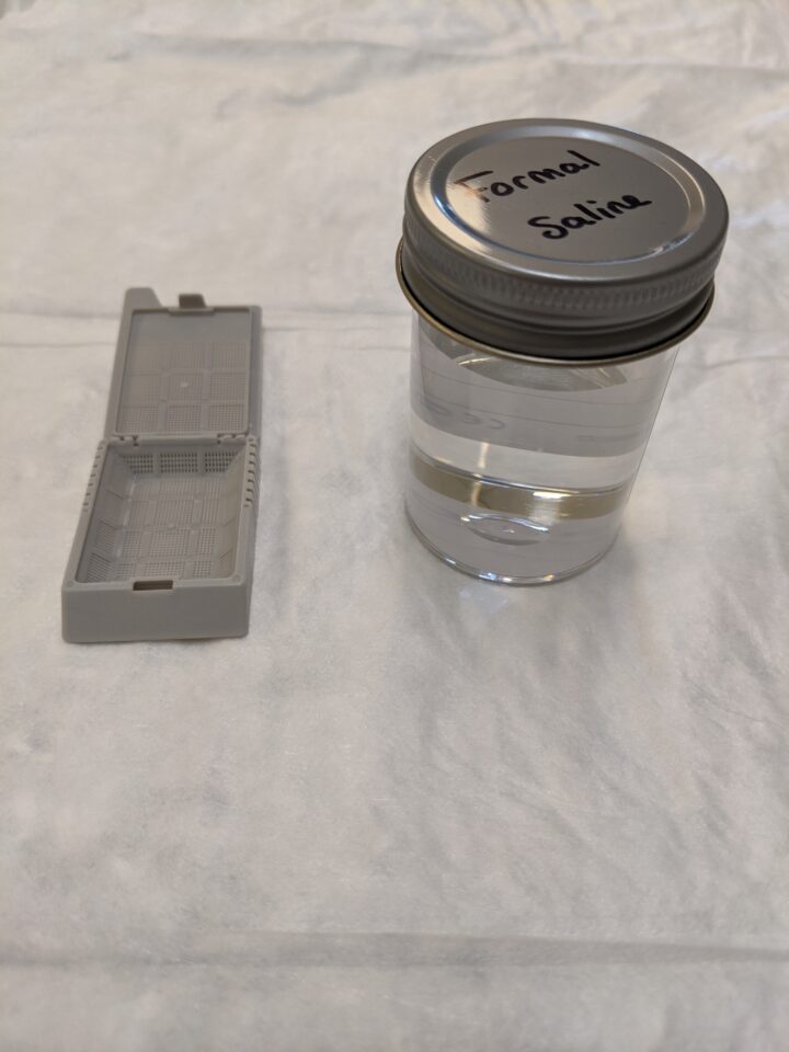 During the procedure, biopsy samples are collected as part of the diagnostic work-up, therefore equipment is needed to store and transport these. Because endoscopic samples are small and delicate, care must be taken not to damage them which would make them unviable for histopathological examination. Biopsy samples will need to be fixed in formal saline once collected, and biopsy cassettes are useful to keep the tiny samples contained in the histopathology pot (Figure 6). One cassette should be used per anatomical region biopsied.
