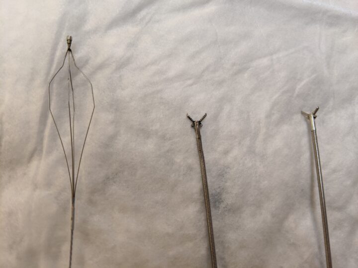 Depending on the indication for performing GI endoscopy, various endoscopic instruments may be required (Figure 5), including biopsy forceps, FB retrieval forceps, aspiration needles and cytology brushes. Reusable equipment (eg FB retrieval forceps) must be cleaned and properly sterilised between patients. Before use, all instruments must be checked to ensure they are working correctly (such as the jaws opening and closing properly) to avoid prolonging procedure time. Additionally, a visual inspection of the hinges and shaft to assess for damage should be performed to minimise the risk of trauma to the instrument channel. VNs should check that the correct size of instrument is used for each endoscope, and the surgeon should never force an instrument if there is resistance as this risks damaging the endoscope.