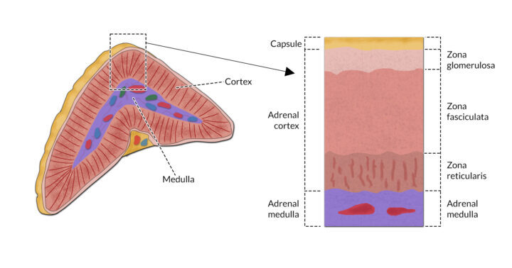 The adrenal glands are paired structures located close to the cranial aspect of each kidney. Each gland consists of an outer cortex and inner medulla (Figure 1). Both layers act independently of each other and are controlled by different mechanisms.