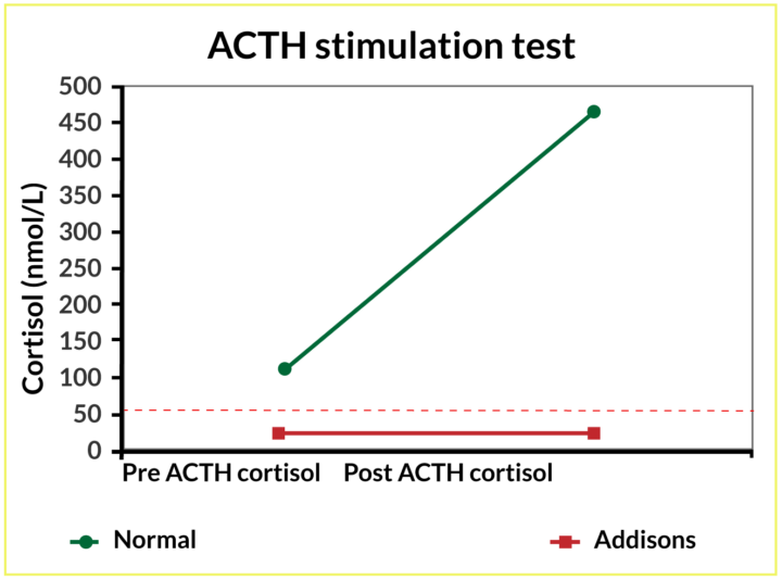 Basal cortisol will be low and can, therefore, be used as a screening test for hypoadrenocorticism. The literature shows that hypoadrenocorticism is unlikely if basal cortisol is above 55nmol/l (Bovens et al., 2014). However, to definitively diagnose hypoadrenocorticism, a complete adrenocorticotropic (ACTH) stimulation test is needed. In a healthy patient, the adrenal gland should release cortisol in response to the stimulation test, a response that would register in the post-ACTH sample. Patients with hypoadrenocorticism are unable to mount this response; no stimulation (release of cortisol) is measurable in the post-ACTH sample (Figure 2).