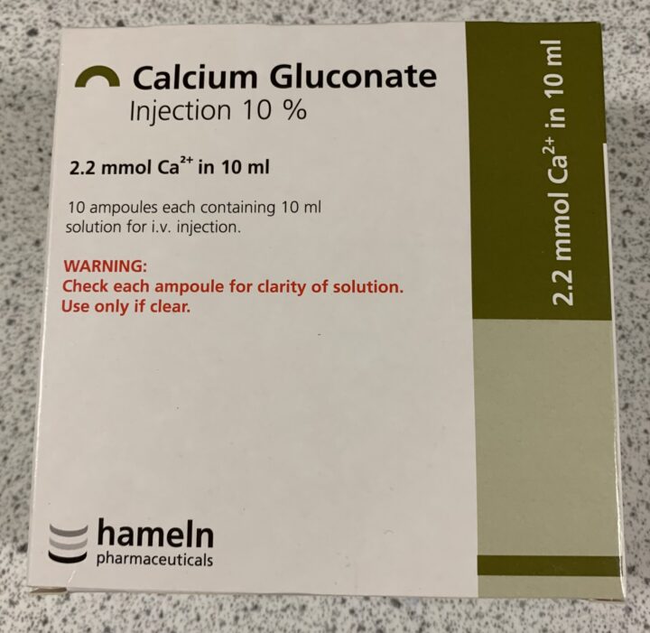 Calcium gluconate 10% (Figure 4), administered by slow constant-rate infusion (CRI), can be used as a cardioprotective measure. Although this will not reduce the circulating levels of potassium (so the patient remains hyperkalaemic), it will raise the cardiac threshold potential, protecting the heart from the effects of hyperkalaemia. The hyperkalaemia will, however, still need to be addressed. One important consideration when administering calcium gluconate by CRI is to ensure an ECG is attached and monitored due to the risk of worsening the bradycardia.