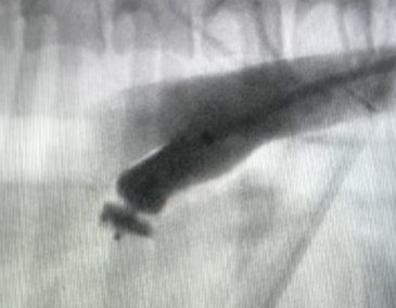 Step one: Vascular access is obtained via a surgical cut down to the right femoral artery, with the placement of a vascular introducer in the artery via a modified Seldinger technique. A pigtail catheter is then advanced to the level of the PDA under fluoroscopic guidance, and a bolus of radiopaque contrast is given. This produces an angiographic image of the ductus (Figure 4).