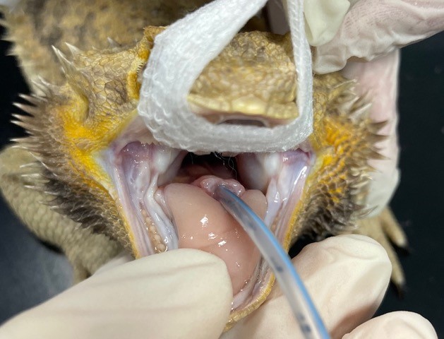 Intubation of reptiles is essential as all reptiles require intermittent positive pressure ventilation (IPPV) under anaesthesia. Once the patient has been appropriately induced, the glottis can be located at the base of the tongue in most reptilian species (Figure 3) (Olsson and Simpson, 2018). As the patient takes a breath, the glottis opens and the endotracheal tube can be advanced. An uncuffed tube is recommended, and tubes can be secured in any number of ways to ensure they stay in place for the duration of anaesthesia (Figure 4) (Worrell, 2019).