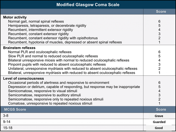 Other markers (such as the clinical signs listed in the next section) can be used in conjunction with ATT and a modified Glasgow Coma Scale (MGCS) (Figure 1) to assess the patient’s motor activity, brain stem reflexes and level of consciousness. These assessments will help assess morbidity and the potential success of treatment. The MGCS has a total score of 18, though unlike the ATT, a lower score indicates a poorer prognosis. This scoring system serves as a serial monitoring tool to indicate improvement and deterioration.