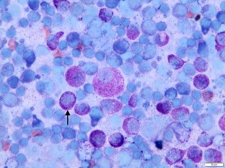 In most cases, MCTs are diagnosed easily via fine needle aspirate cytology. The round cells contain characteristic metachromatic cytoplasmic granules (Figure 3), although high-grade MCTs may lack granules and can, therefore, be challenging to differentiate from other round cell tumours.